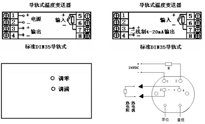 對導(dǎo)軌式溫度變送器輸入可以是熱電偶、熱電阻、標(biāo)準(zhǔn)信號。工作電源接端子1、24~20mA輸出信號接3正、4負(fù);對二線制4~20mA輸入信號正接5、負(fù)接6;熱電阻單端A5、并聯(lián)端BC分別接6、7