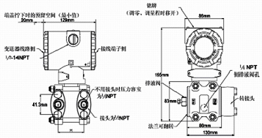 例:TDSB3051差壓變送器,量程0-300kpa,兩線制4~20 mA DC信號輸出,法蘭接頭、排氣/排液閥、隔離膜片均為316不銹鋼,智能表顯示器,管裝平支架,泄放閥在壓力室側(cè)面的,橢圓接頭內(nèi)螺紋NPT 1/2