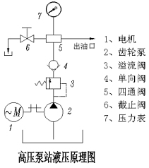 電動機通過聯(lián)軸器直接帶動齒輪泵泵油,壓力油經(jīng)過溢流閥調(diào)節(jié)通往單向閥到達四通集成塊,分別供給壓力表、調(diào)節(jié)截止閥和用油對象供油;